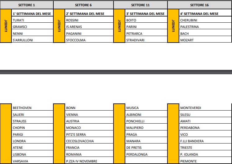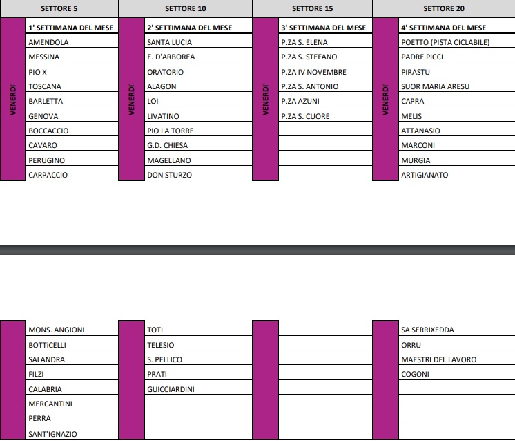Spazzamento, lavaggio e pulizia. Gli uomini della De Vizia, a Quartu, sono pronti a tornare in azione con pompe, idropulitrici e scope per garantire la massima igienizzazione nelle strade della città, dal centro alla periferia, arrivando sino al viale Poetto. Si tratta di interventi, per quanto classificati come supplementari, inseriti nell’appalto della raccolta differenziata. Così, dopo le tante lamentele di commercianti e residenti, sempre pronti a puntare il dito contro le strade sporche e invase dai rifiuti, scatta l’operazione pulizia. E in parallelo, anche i divieti di sosta per le automobili, con rimozione forzata per gli automobilisti sbadati: per far passare correttamente i mezzi della De Vizia, infatti, sarà necessario lasciare libere le parti delle strade più vicine ai marciapiedi, e parcheggiare altrove. L’avviso arriva direttamente dal Comune, e il rischio di beccarsi una multa è dietro l’angolo. E tutte le operazioni si svolgeranno di notte, tra le 22:30 e le cinque del mattino (proprio la fascia oraria nella quale sarà vietato parcheggiare). Ecco, di seguito, l’elenco delle strade e dei giorni.