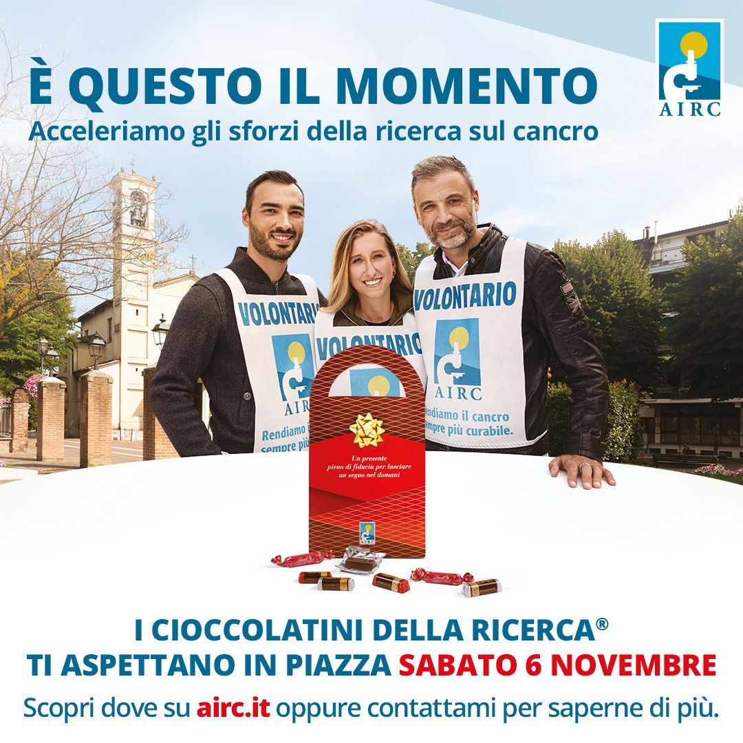 Sabato 6 e Domenica 7 Novembre tornano i volontari AIRC, in 1.200 piazze, compatibilmente con le indicazioni delle autorità sanitarie, per distribuire i Cioccolatini della Ricerca a fronte di una donazione di 10 euro. Insieme viene offerta una Guida con informazioni sui traguardi raggiunti per la cura del tumore del colon e dei linfomi, oltre ad alcune ricette per realizzare piatti sani e gustosi.