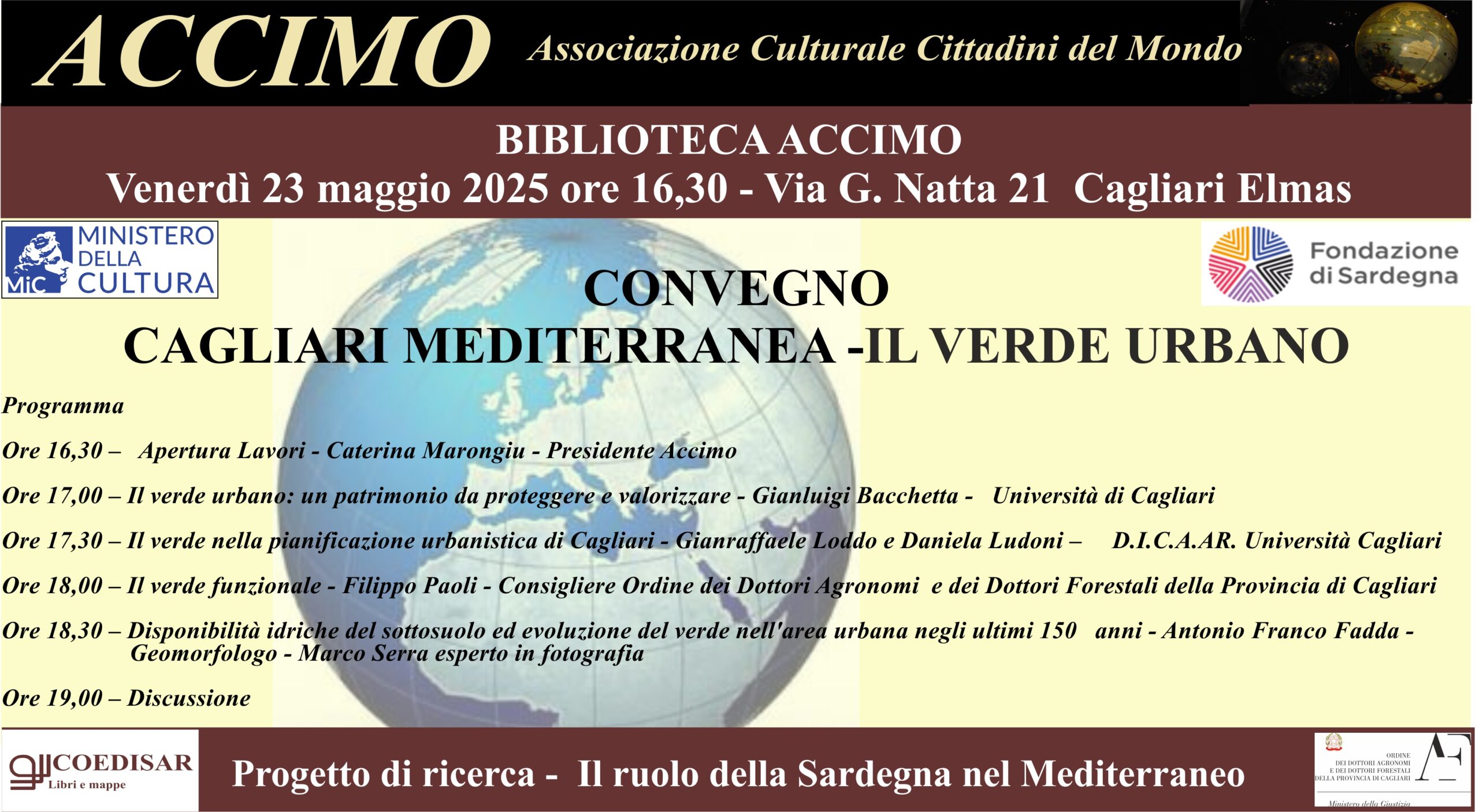 Il prestigioso evento culturale si terrà venerdi 23 Maggio ad Elmas, alle ore 16.30 presso la sede dell’Accimo (“Associazione Culturale Cittadini del Mondo”) in via Natta 21, nella Zona Industriale Est., Cagliari-Elmas, evento facente parte delle iniziative previste nel Progetto di Ricerca sul Ruolo della Sardegna nel Mediterraneo Occidentale.