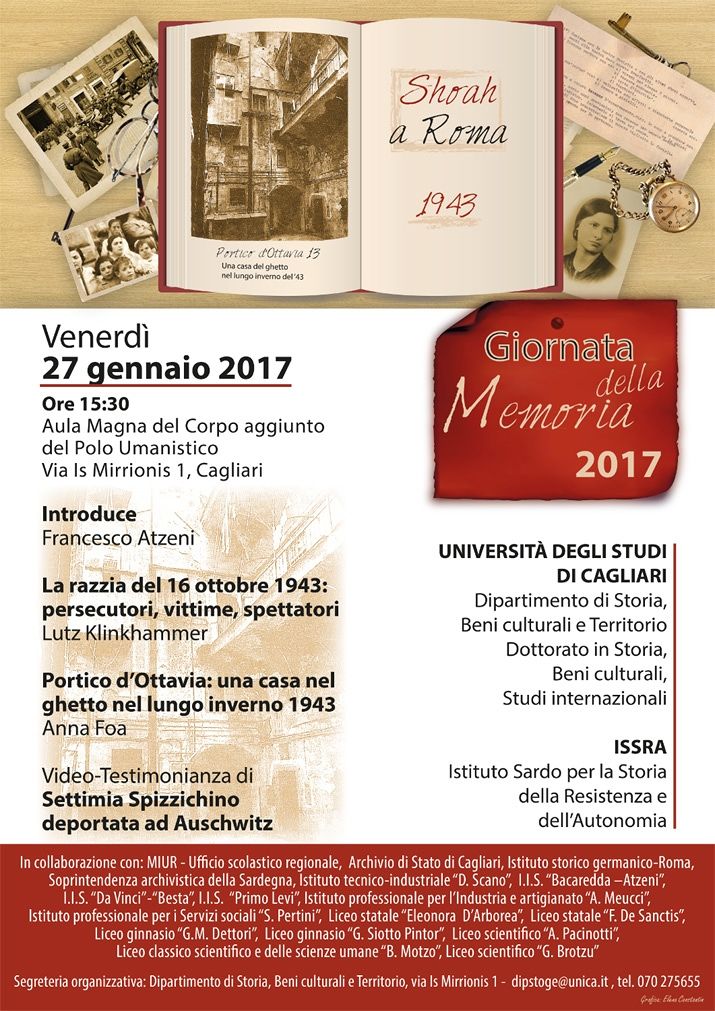In occasione della Giornata della memoria dei Lager e della Shoah, è promosso l’incontro di riflessione storica e di dibattito “SHOAH A ROMA”, in programma a Cagliari – venerdì 27 gennaio 2017, alle 15,30 – nell’Aula magna del Corpo aggiunto di via Is Mirrionis 1 (Polo Umanistico, loc. Sa Duchessa).