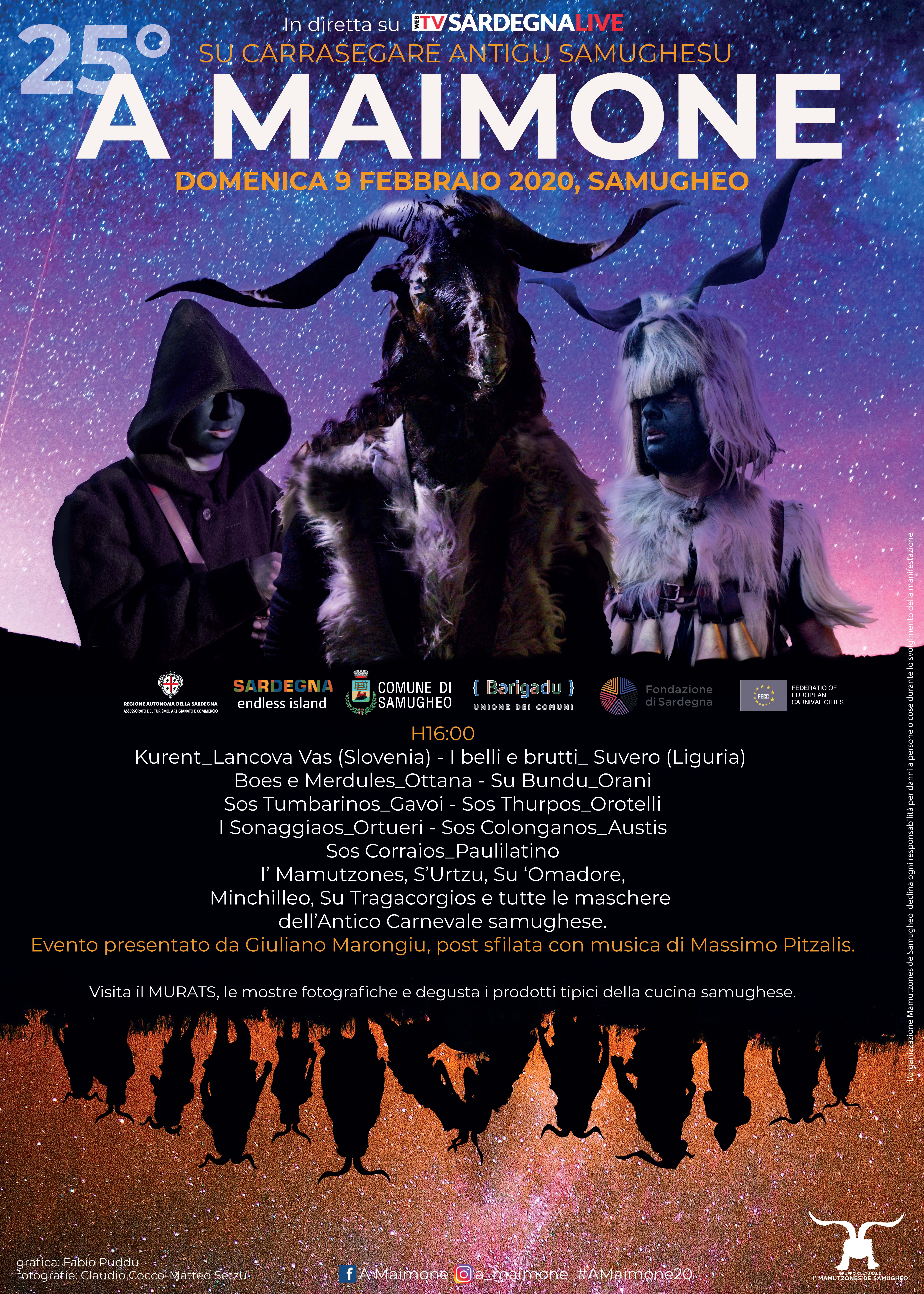 Occhi puntati sulle figure del carnevale samughese (I Mamutzones, S’Urtzu, Su ‘Omadore, Su Tragacorgios e Minchilleo), alle quali si aggiungeranno le altre maschere tradizionali della Sardegna e due gruppi provenienti da Liguria e Slovenia. Un tripudio di suoni e colori caratterizzerà la sfilata che dalle ore 16 si sposterà dalla parte alta del paese alla piazza centrale.