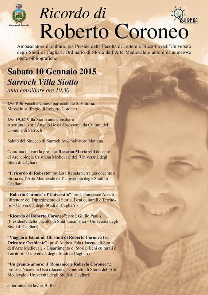 Sabato 10 gennaio 2015, a Villa Siotto a Sarroch, nell’aula consiliare alle 10,30 si svolgerà un Ricordo di Roberto Coroneo, cui parteciperanno (vedi locandina) i docenti universitari Rossana Martorelli, Renata Serra, Francesco Atzeni, Giulio Paulis, Andrea Pala, Nicoletta Usai. Coordina i lavori Rossana Martorelli