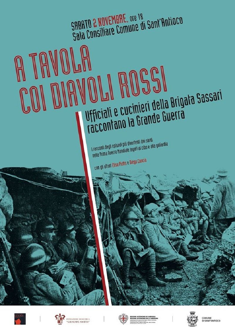 Gli attori Diego Coscia ed Elisa Pistis porteranno in scena sabato 2 novembre alle 18 nella Sala Consiliare del Comune di Sant’Antioco, lo spettacolo ‘A tavola coi Diavoli Rossi’, un reading teatrale incentrato su un aspetto sorprendente, umanissimo, a volte tralasciato o considerato di minore importanza nella Grande Guerra: il cibo. L’evento, realizzato dal Comitato Sardo per le Celebrazioni dei Grandi Eventi con il contributo dell’Assessorato alla Cultura della Regione Sardegna e del Comune di Sant’Antioco, è organizzato dalla Fondazione di ricerca Giuseppe Siotto. Ingresso libero e gratuito fino ad esaurimento posti.