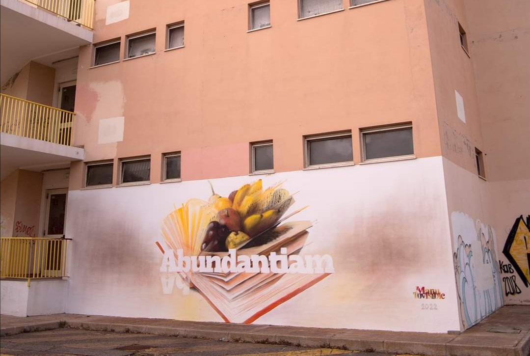 “Ad Abundantiam” è il nuovo murale di Manu Invisible realizzato nella parete dell’istituto alberhiero “Gramsci” di Monserrato: gli studenti hanno partecipato all’opera per esprimere “una visione di futuro possibile”. Quarzo e spray su 44 mq, un insieme di colori condivisi dall’artista con i ragazzi dell’alberghiero per realizzare un’ opera colma di significato. Ed ecco l’ennesima opera firmata da Manu Invisibile, artista sardo formatosi tra le mura del liceo artistico di Cagliari. I suoi docenti lo ricordano bene: ogni tanto aveva bisogno di “allontanarsi” ma sapevano che lo avrebbero trovato da “qualche parte” intento a creare con i suoi colori, la sua arte.