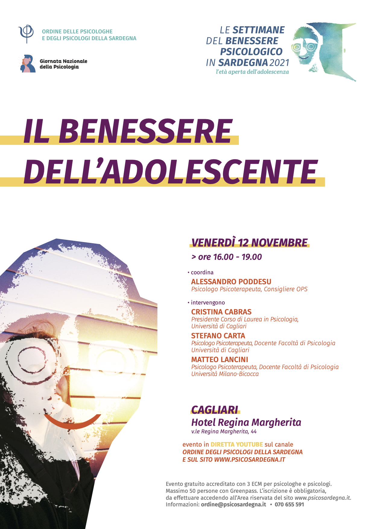 Rabbia, azioni violente contro se stessi e altri, isolamento, disturbi alimentari, depressione, ansia: questi alcuni degli effetti devastanti sugli adolescenti, favoriti dalla pandemia e non ancora pienamente compresi e analizzati: quali interventi sono urgenti e necessari, innanzitutto sul piano psicologico, per aiutarli a superare tali situazioni di criticità? Se ne parlerà venerdì 12 novembre a Cagliari al convegno “Il benessere dell’adolescente”, nell’ambito delle Settimane del Benessere Psicologico, in corso da metà ottobre in tutta l’isola. Il convegno, con inizio alle 16, si terrà a presso l’Hotel Regina Margherita in Viale Regina Margherita 44, è gratuito, aperto a tutti ed è accreditato con 3 crediti ECM per Psicologhe e Psicologi: nel rispetto delle norme anti covid è necessario iscriversi attraverso l’area riservata del sito https://psicosardegna.it/ ed è necessario il greenpass.