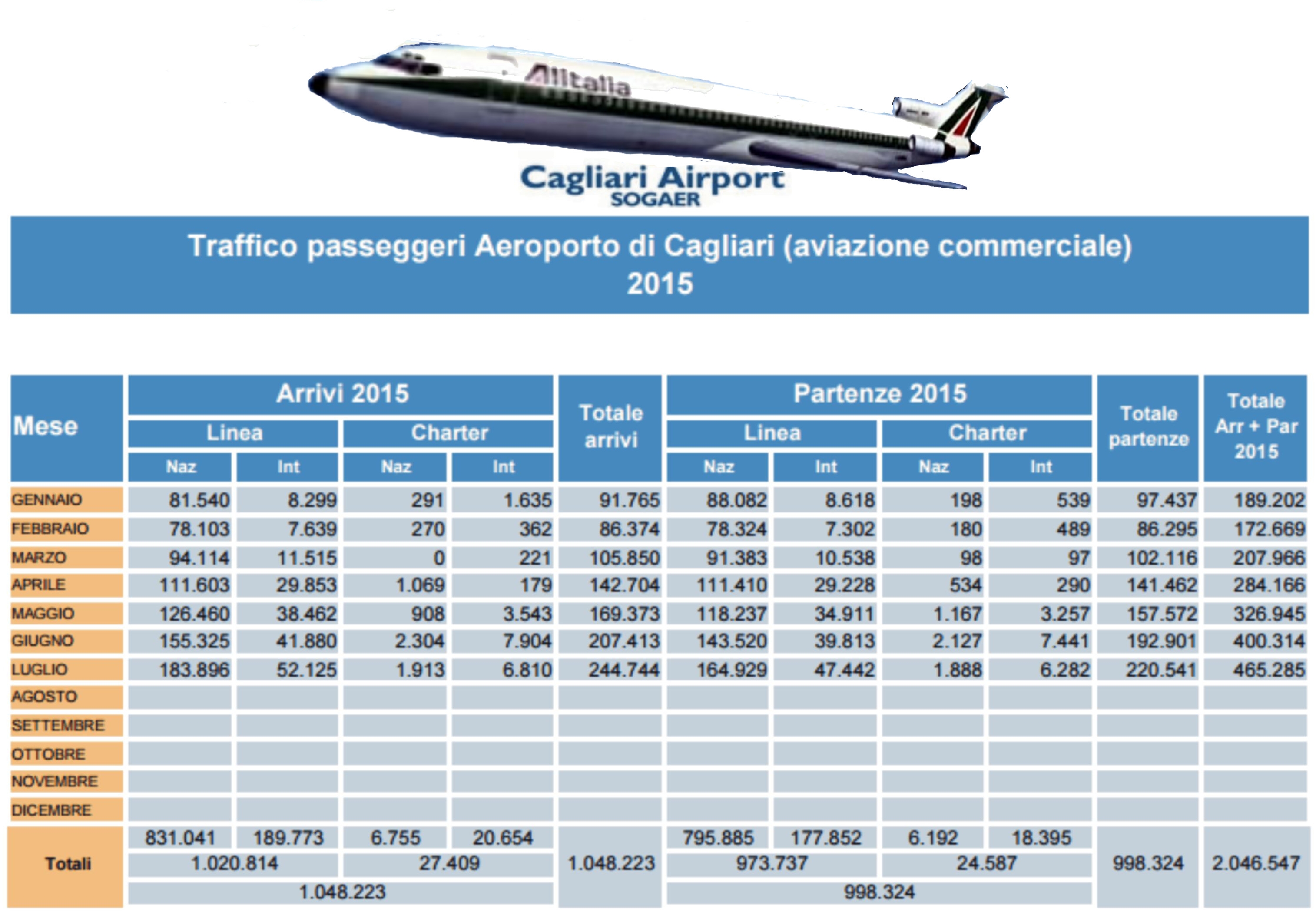 L’aeroporto di Cagliari solo nel mese di luglio 2015 ha segnato tra arrivi e partenze la cifra