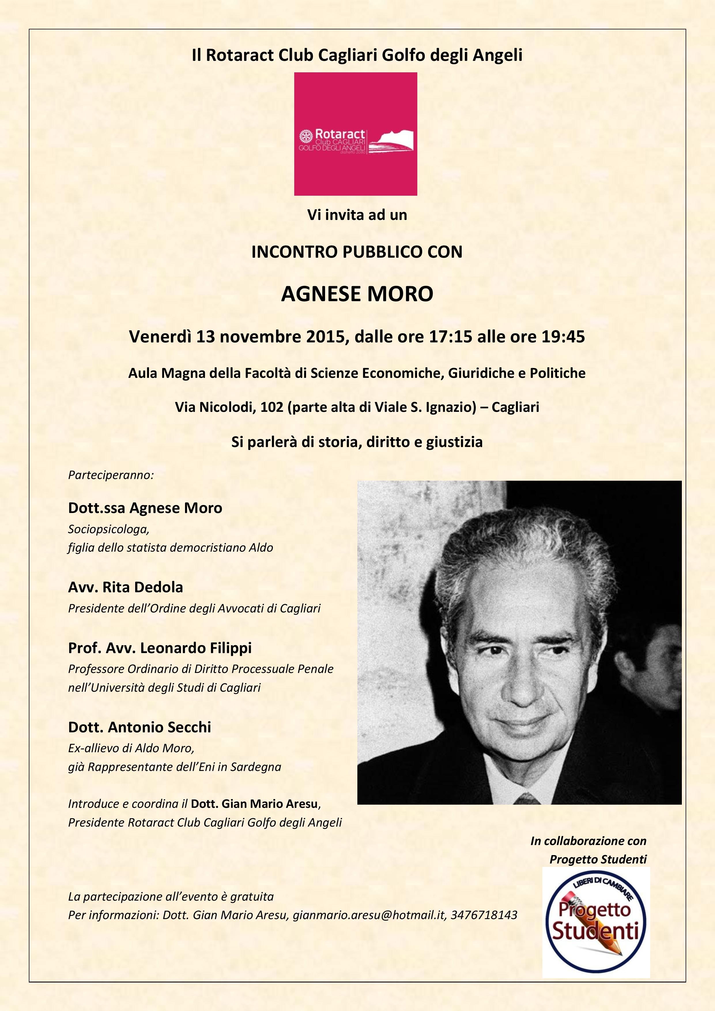 Oltre ad Agnese Moro, sociopsicologa, parteciperanno il presidente dell’Ordine degli Avvocati di Cagliari, Rita Dedola, l’avvocato Leonardo Filippi, ordinario di Diritto processuale penale nell’Ateneo di Cagliari, e Antonio Secchi, già rappresentante dell’Eni in Sardegna ed ex-allievo di Aldo Moro. Introduce e coordina i lavori Gian Mario Aresu, presidente del Rotaract Club Cagliari Golfo degli Angeli.
