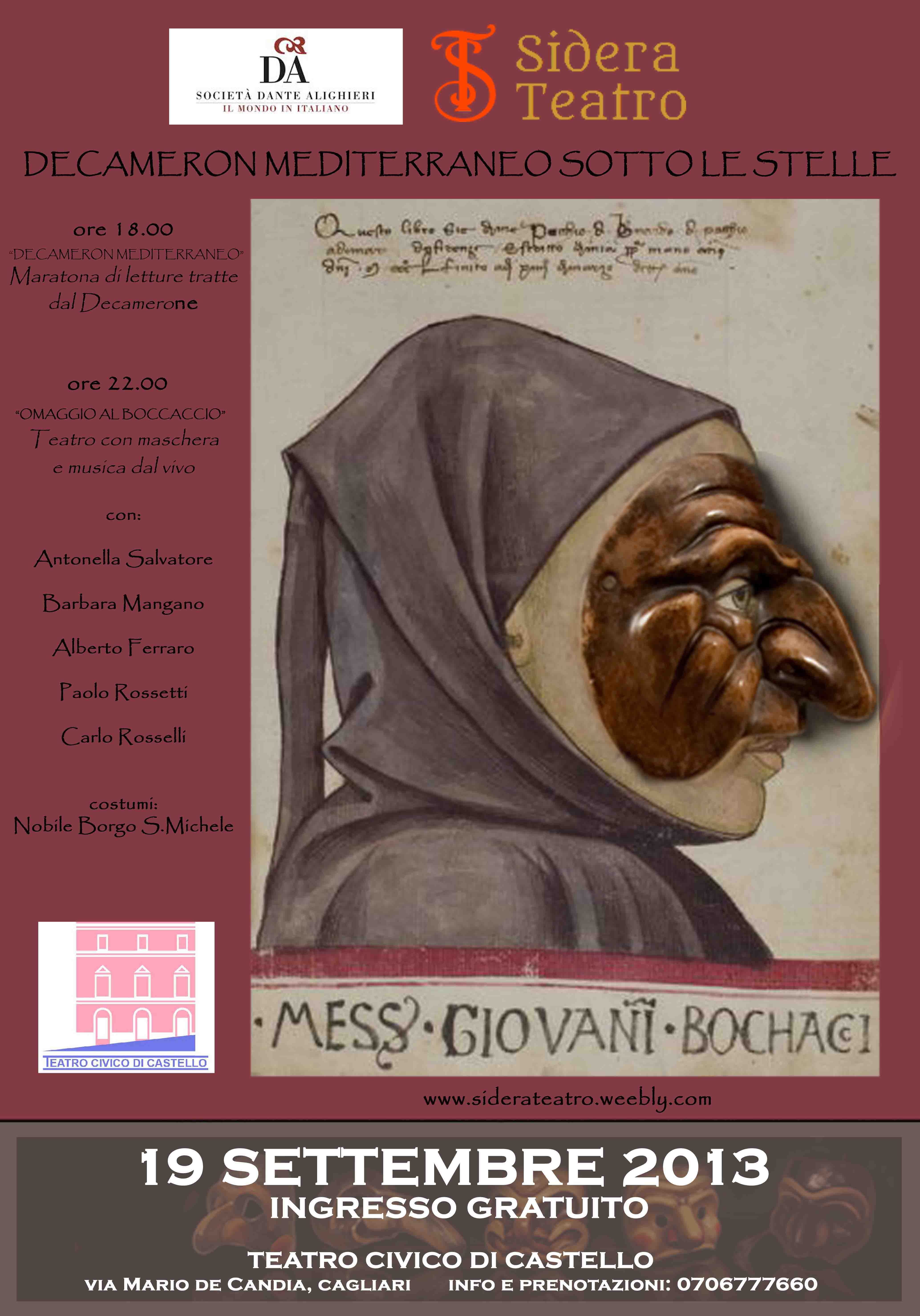Una maratona di letture pubbliche tratte dal Decamerone aprirà “Decameron Mediterraneo sotto le stelle”, la manifestazione inaugurale dell’81mo congresso della Dante Alighieri a Cagliari nei prossimi giorni in occasione del 700mo anniversario della nascita di Giovanni Boccaccio (sul tema “Dal sud del mondo. La lingua, la cultura e l’economia italiane. La Sardegna come ponte sul Mediterraneo”). L’appuntamento è per giovedì 19 settembre al Teatro De Candia a partire dalle 18: chiunque, fino alle 22, potrà cimentarsi nella lettura dei testi davanti alle telecamere di Lamberto Lambertini. L’evento sarà trasmesso in streaming sui siti ladante.it, premioletterarioboccaccio.it, cagliari.globalist.it.