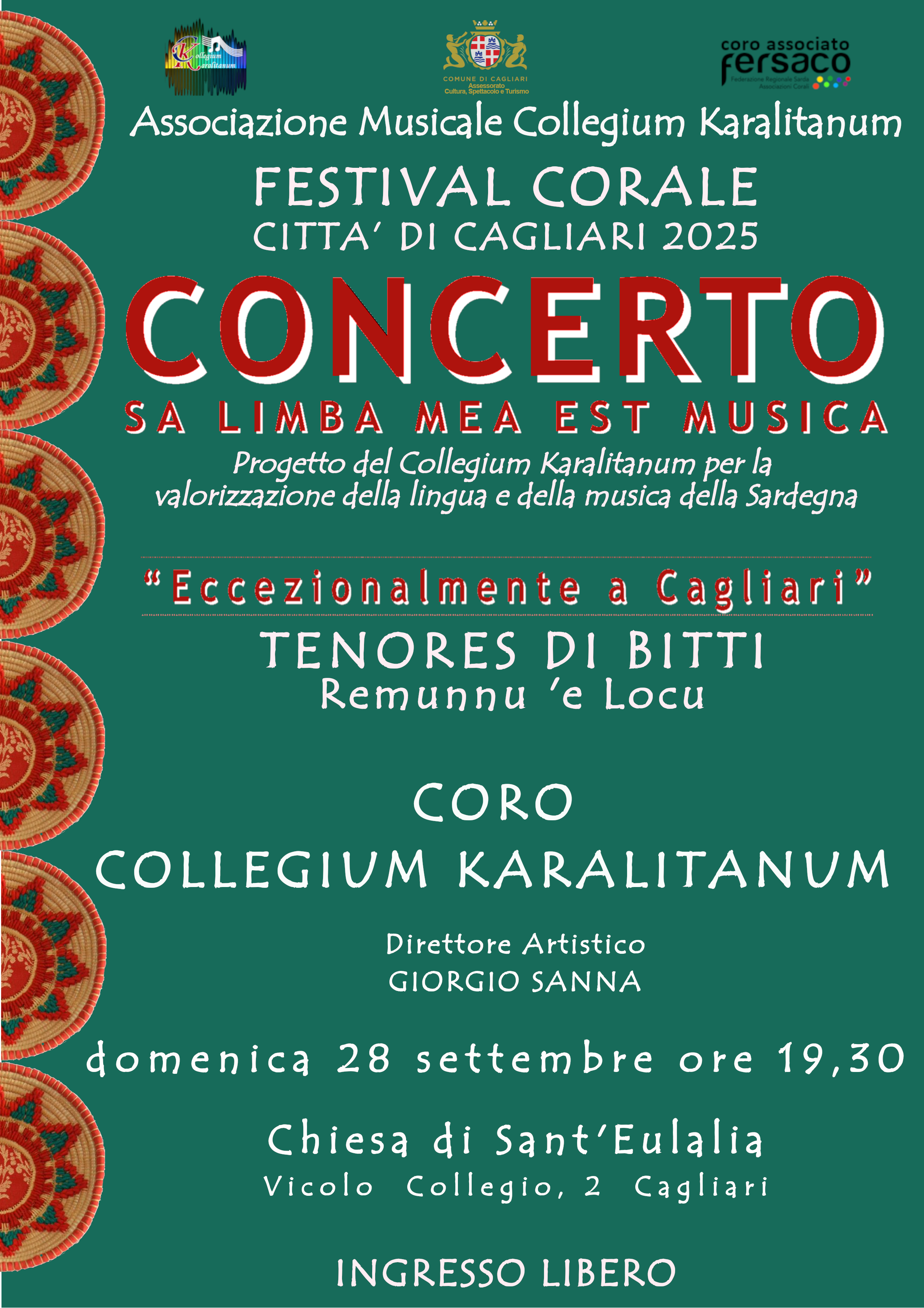 Si comincia domenica 28 settembre 2025. Alle 19.30, nella chiesa di Sant’Eulalia si esibiranno i Tenores di Bitti Remunnu ‘e Locu, ambasciatori nel mondo del canto a tenore, patrimonio immateriale dell’UNESCO- Seguirà la “Ninna nanna campidanese” del compositore sardo Franco Oppo, inventore del prestigioso “Festival Spaziomusica” del Coro Collegium Karalitanum diretto da Giorgio Sanna.