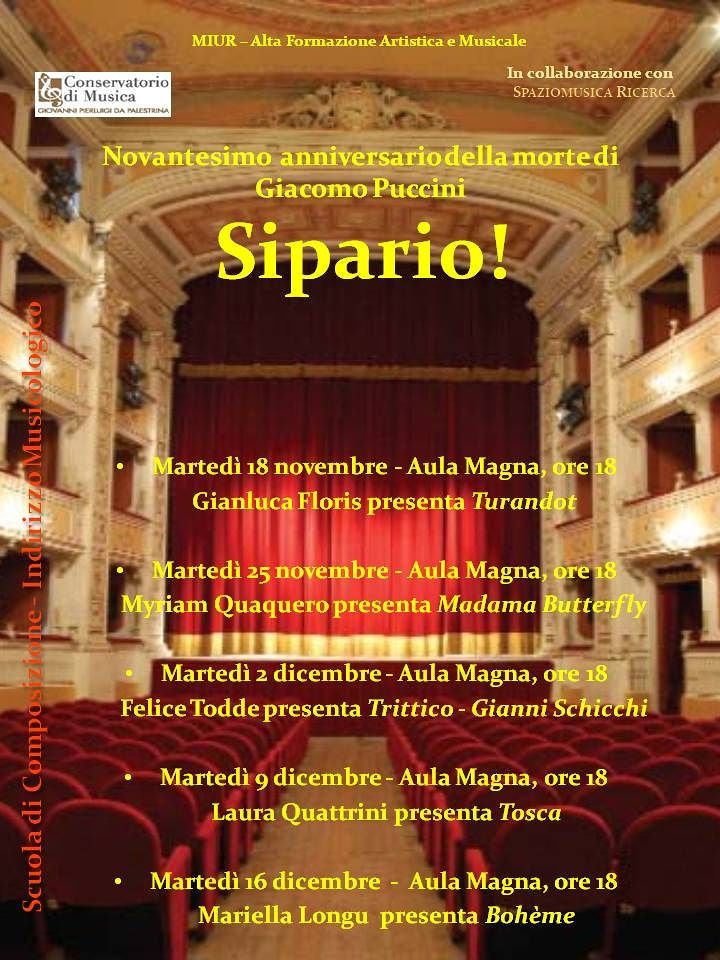 In occasione del novantesimo anniversario della scomparsa di Giacomo Puccini, prende il via la seconda edizione di “Sipario!”, il ciclo di incontri dedicati ad alcuni dei più famosi melodrammi del grande operista, organizzato dalla Scuola di Composizione del Conservatorio di musica “G. Pierluigi da Palestrina” di Cagliari in collaborazione con l’Associazione Spaziomusica Ricerca. Pensata come un’opportunità di conoscenza e divulgazione della storia del teatro musicale europeo, la rassegna si snoderà fino al prossimo dicembre e prevede cinque conferenze di altrettanti esperti, che tratteranno le diverse opere impiegando anche supporti sonori, audio e video, ed esemplificazioni estemporanee al pianoforte.