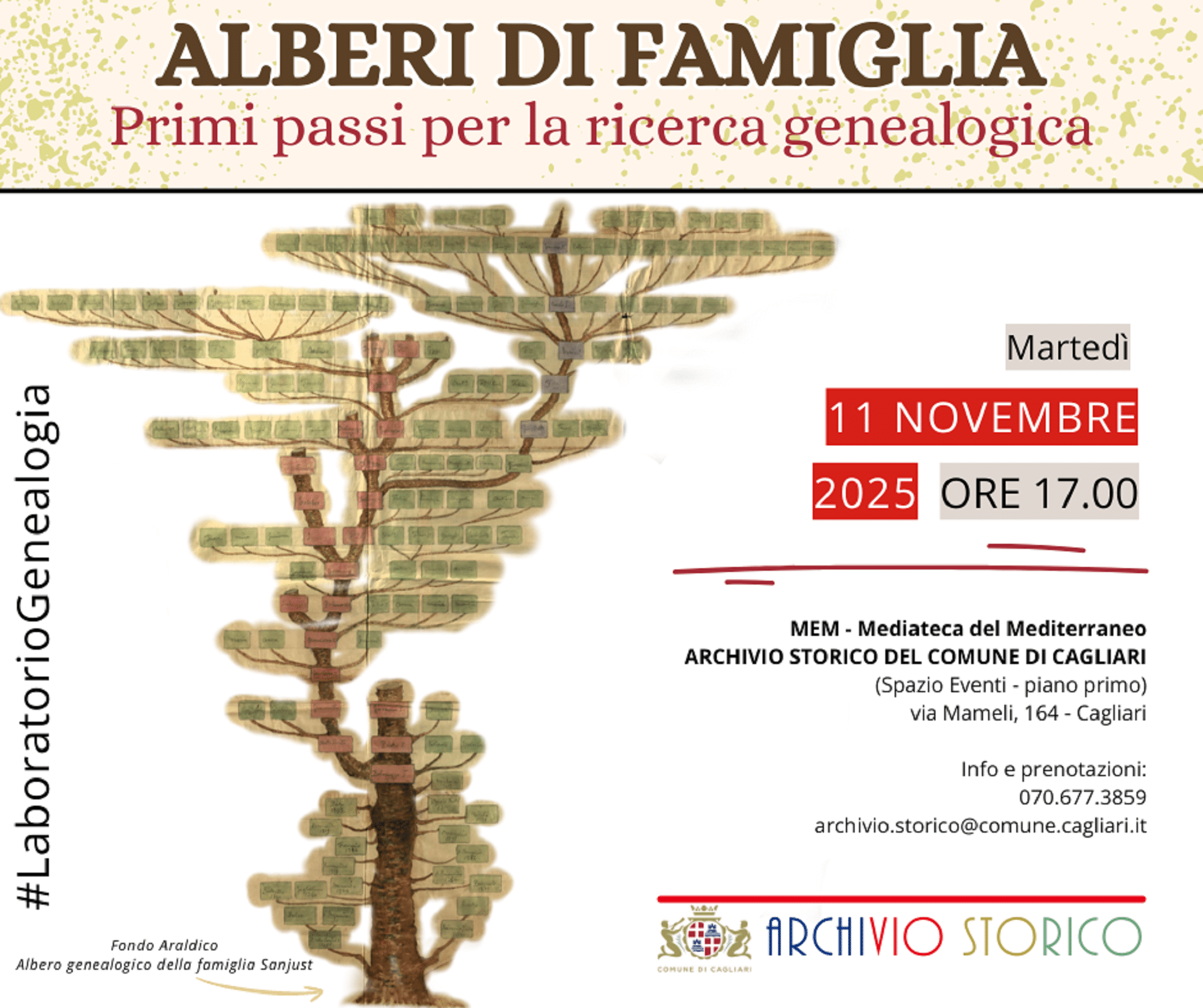 Dedicato a chi per la prima volta vuole cimentarsi nella ricerca delle proprie radici, all’Archivio storico comunale di Cagliari, laboratorio “Alberi di famiglia: primi passi per la ricerca genealogica”. Gratuito, l’appuntamento è in programma martedì 11 novembre dalle ore 17, allo Spazio Eventi al piano secondo della MEM – Mediateca del Mediterraneo di via Mameli n. 164.