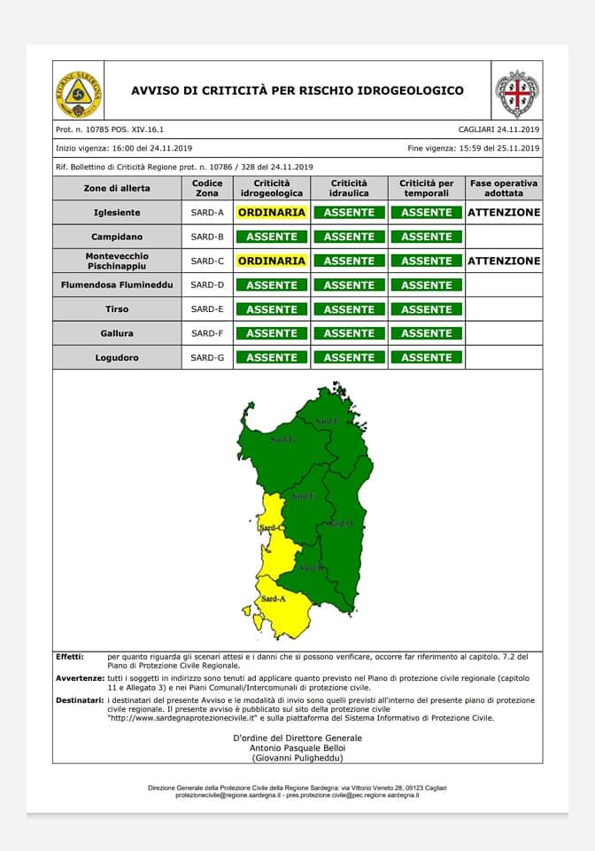 Allerta gialla in Sardegna sino alle 16 di lunedì: ecco la mappa delle zone più a rischio. Sono i sindaci in queste ore a rilanciare l’allerta lanciata dalla Protezione Civile per oggi e domani nell’Isola: “Buona domenica Cari concittadini,vi informo che la Protezione Civile ha emesso un AVVISO DI ALLERTA per CRITICITÀ ORDINARIA- spiega la sindaca di Pula Carla Medau- dalle 16 di oggi, domenica 24, alle 16 di domani, lunedì 25 novembre. Vi invito a prestare attenzione ed essere prudenti”.