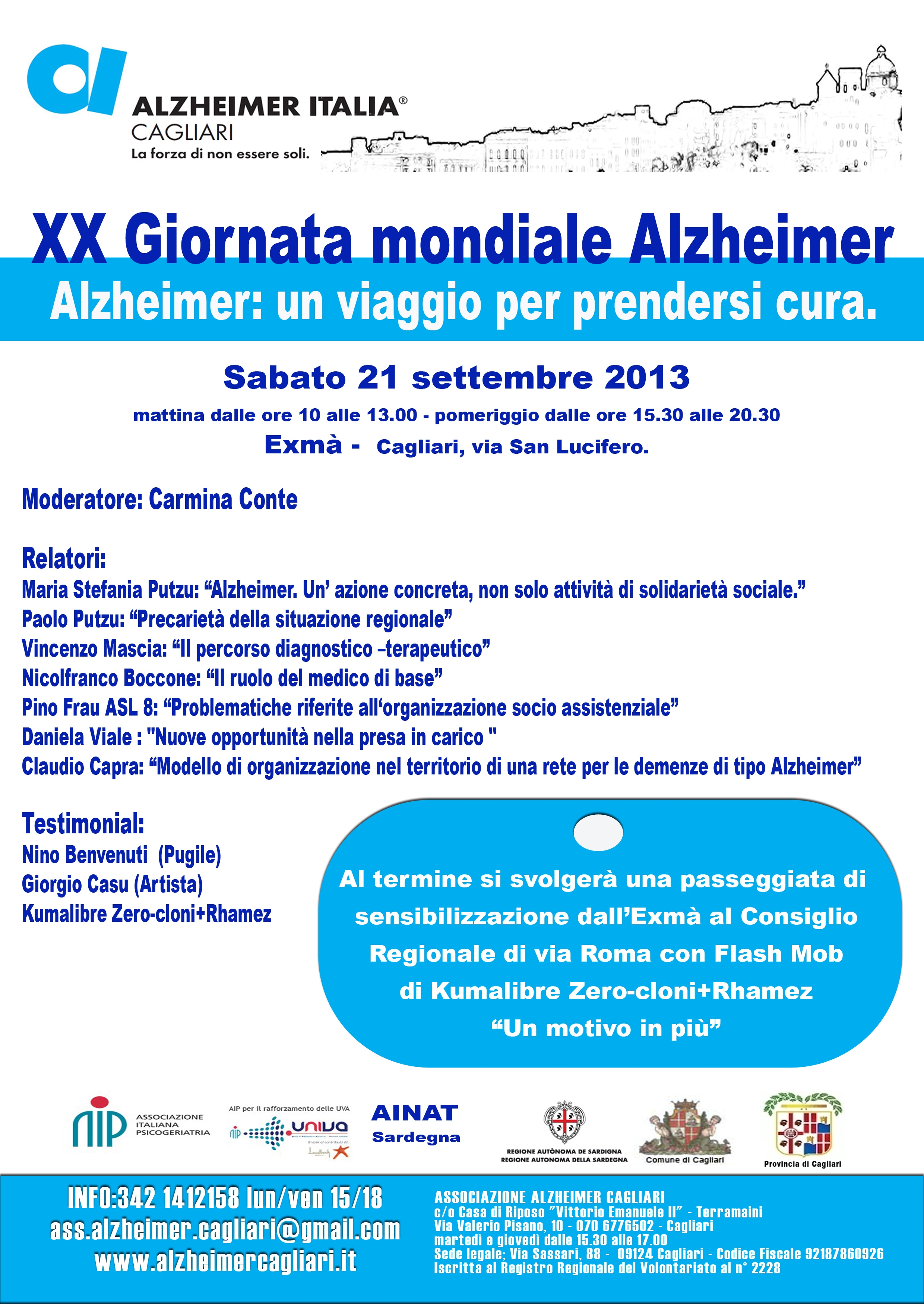 Arte e scienza s’intrecciano nella XX Giornata Mondiale dell’Alzheimer/ “ALZHEIMER: un viaggio per prendersi cura” organizzata dall’Associazione Alzheimer Cagliari per sabato 21 settembre 2013 a partire dalle 10 fino alle 19 negli spazi dell’ExMà in via San Lucifero a Cagliari: un fitto programma di interventi e relazioni per fare il punto sulla situazione sarda.