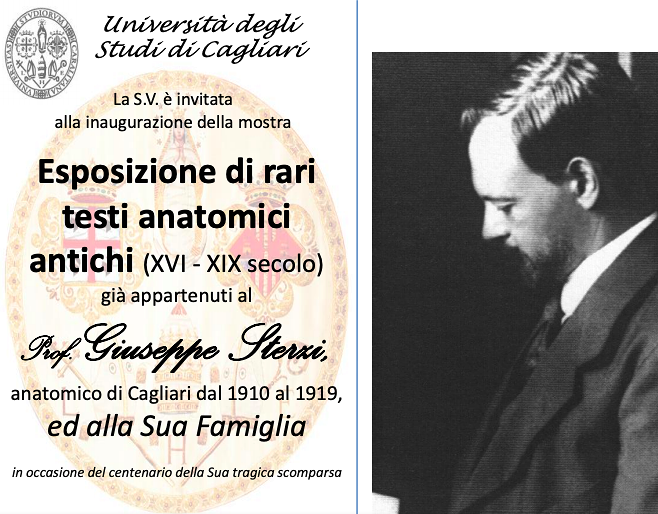 Il Museo “Raccolta delle Cere Anatomiche di Clemente Susini” in collaborazione con la Biblioteca Biomedica ed il Dipartimento di Scienze Biomediche nel centenario della morte del Prof. Giuseppe Sterzi (1876-1919), Direttore dell’Istituto Anatomico di Cagliari negli anni 1910-1919, organizza l’esposizione di rari testi scientifici donati dal Prof. Sterzi e dalla Sua famiglia all’Università di Cagliari. Una selezione di tali preziosi testi, catalogati in un fondo speciale ad opera del compianto Signor Beniamino Orrù (1943-2013), già promotore e Direttore della Biblioteca del Distretto Biomedico-scientifico “B. Orrù”, sarà qui esposta al pubblico per la prima volta.