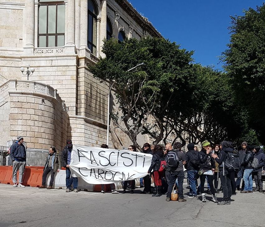 Uno striscione bianco con una scritta nera: due parole, “fascisti carogne”. In venti si sono ritrovati in piazza Costituzione per protestare contro il comizio di Simone Di Stefano, candidato premier di CasaPound. Il gruppetto di antifascisti, dopo aver sostato per circa mezz’ora sotto il bastione di Saint Remy, si è spostato verso la via Roma, per poi entrare nelle strade del rione portuale della Marina. Una contestazione annunciata, le Forze dell’ordine – polizia, carabinieri e polizia municipale – sono riusciti a tenere i manifestanti a distanza dall’hotel nel quale si è svolto il comizio del partito di estrema destra.