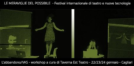 Il prossimo appuntamento è fissato per il 15, alle 19, con la conferenza “Nuove tecnologie per le imprese creative e culturali”. Intanto, sono aperte le iscrizioni per L’ABBANDONO, workshop rivolto ad attori, registi e scenografi a cura di Taverna Est Teatro e diretto dalla regista Sara Sole Notarbartolo, previsto dal 22 al 24 gennaio (la durata complessiva è di 18 ore). Il workshop sul tema de “L’abbandono”, realizzato precedentemente a Torino, Napoli, Palermo e in altre città italiane, giunge ora a Cagliari, ed è parte del percorso drammaturgico per la messa in scena di “VAS”, il nuovo spettacolo di teatro e nuove tecnologie di Taverna Est Teatro, scritto e diretto dalla stessa Notarbartolo. VAS è l’acronimo di Visual Analogic Scale, la scala visiva con cui si misura il dolore, perno del lavoro. Lo strumento per esplorarlo è proprio l’abbandono, inteso sia come senso di vertigine che come idea di affidamento totale.