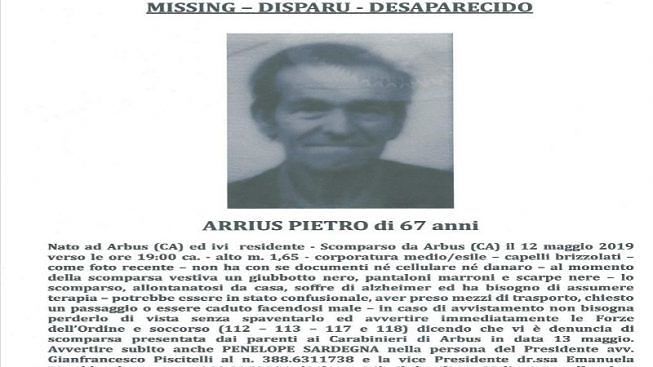 Ancora nessuna traccia di Pietro Arrius, il pensionato di 67 anni, malato di Alzheimer, scomparso il 12 maggio da Arbus. Le ricerche vanno avanti ormai da quattro giorni, del caso si sta occupando anche il noto programma televisivo Chi l’ha visto. “Domenica 12 maggio intorno alle 19 si trovava in un bar dove c’era molta confusione perché si teneva la sagra del cinghiale – si legge sul sito. Gli amici lo hanno visto incamminarsi per via Montevecchio che diventa strada provinciale e porta alla frazione di Montevecchio. Proprio lì è stato avvistato l’ultima volta. Potrebbe avere problemi di orientamento.”