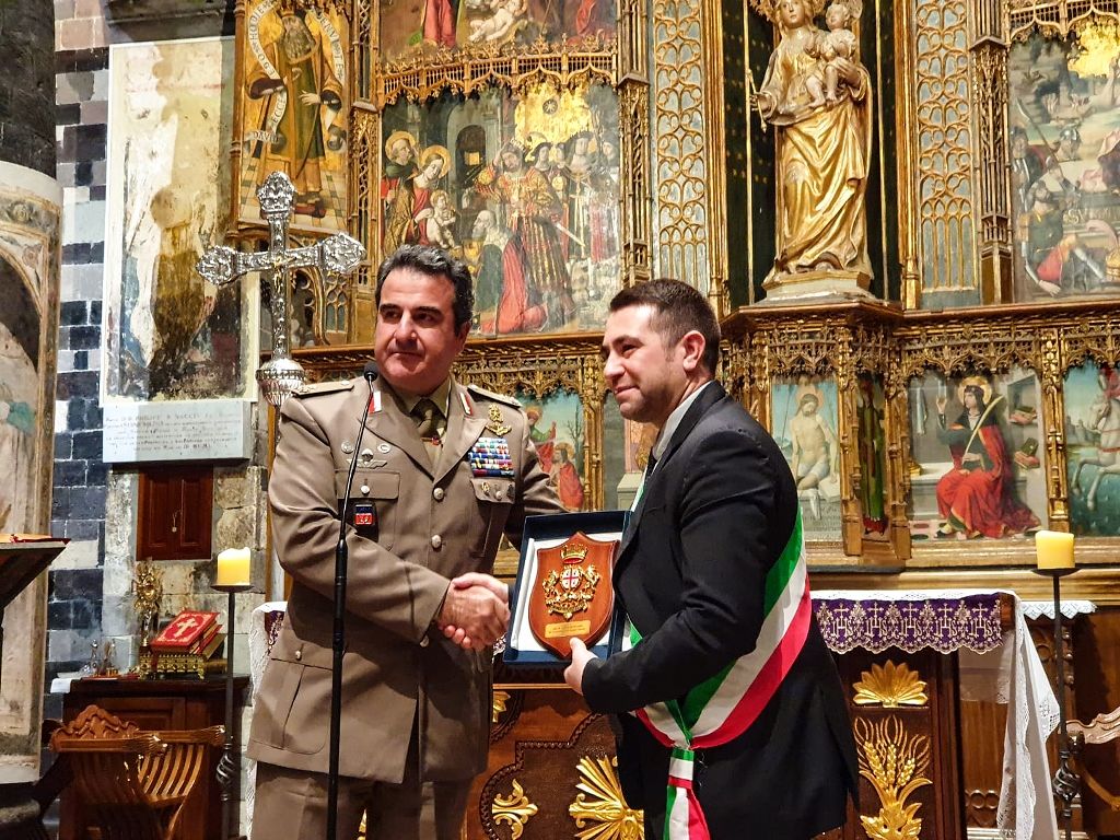 Il prestigioso riconoscimento, votato all’unanimità e deliberato dall’amministrazione comunale cittadina, è stato consegnato dal sindaco Francesco Dui al comandante della Brigata “Sassari”, generale Andrea Di Stasio, nel corso di una cerimonia svoltasi nella basilica di Nostra Signora del Regno alla presenza del vescovo di Ozieri Corrado Melis, del parroco della basilica don Paolo Apeddu e di numerose autorità civili e militari, con la speciale partecipazione della fanfara del 3° reggimento bersaglieri della Brigata “Sassari”.