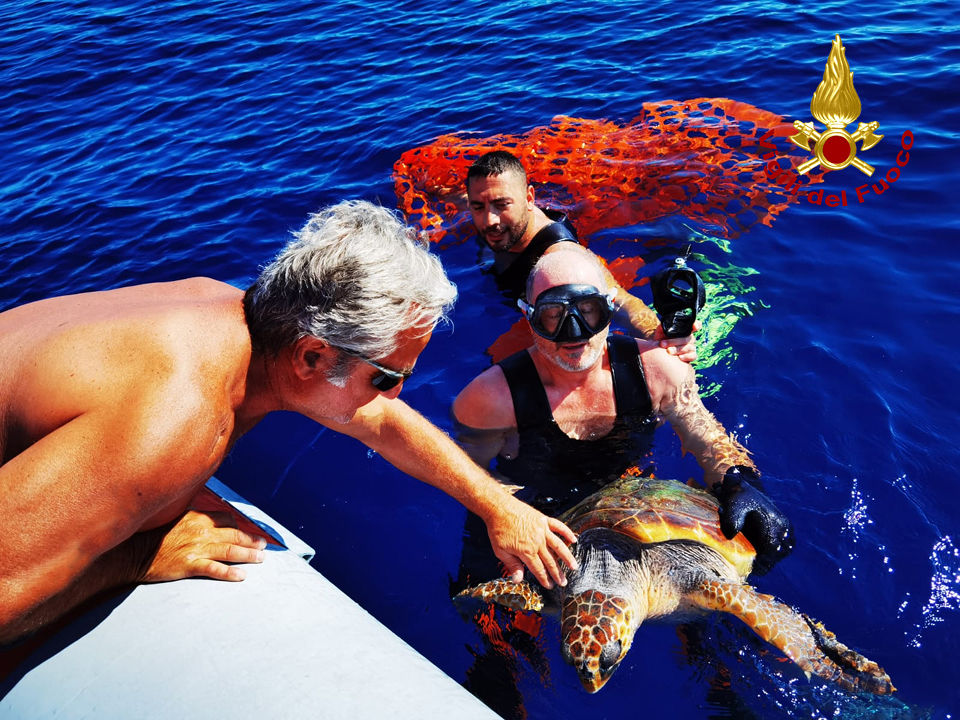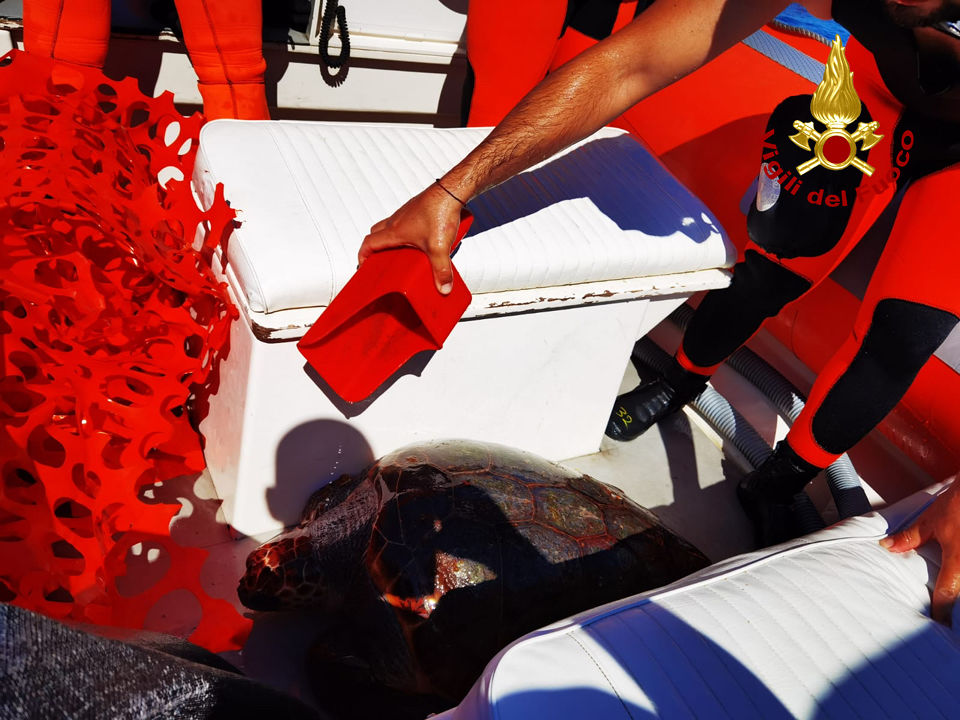 Tartaruga marina salvata in mare dai sommozzatori dei vigili del fuoco.