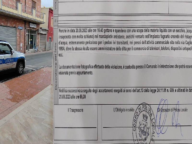 Ha preso la scopa e un secchio pieno d’acqua per togliere le urine e le feci di un cane davanti al suo negozio, in via Cagliari. Peccato, però, che a pulizia ultimata Emanuela Serra, commerciante di Assemini ed ex consigliera comunale, si sia ritrovata davanti agli occhi una pattuglia della polizia Locale. Gli agenti hanno scattato qualche foto e poi compilato la multa: “Gettava e spandeva con una scopa della materia liquida con un secchio, acqua insaponata con molta schiuma, nel marciapiede antistante, anzichè versarlo nell’impianto fognario creando del ristagno d’acqua, estremamente pericoloso per i pedoni”. Multa da cinquanta euro: “61,45, alla fine”, precisa la Serra. Che ha deciso di rendere pubblico il fatto: “Stavo pulendo, quando si dice fai il bene e vai in galera. Il ristagno d’acqua estremamente pericoloso è quello che si vede in foto”, prosegue la commerciante. Che, per un attimo, ha anche pensato di fare ricorso: “Ma alla fine, tra negozio e famiglia ho i tempi stretti, non ce la farei”.