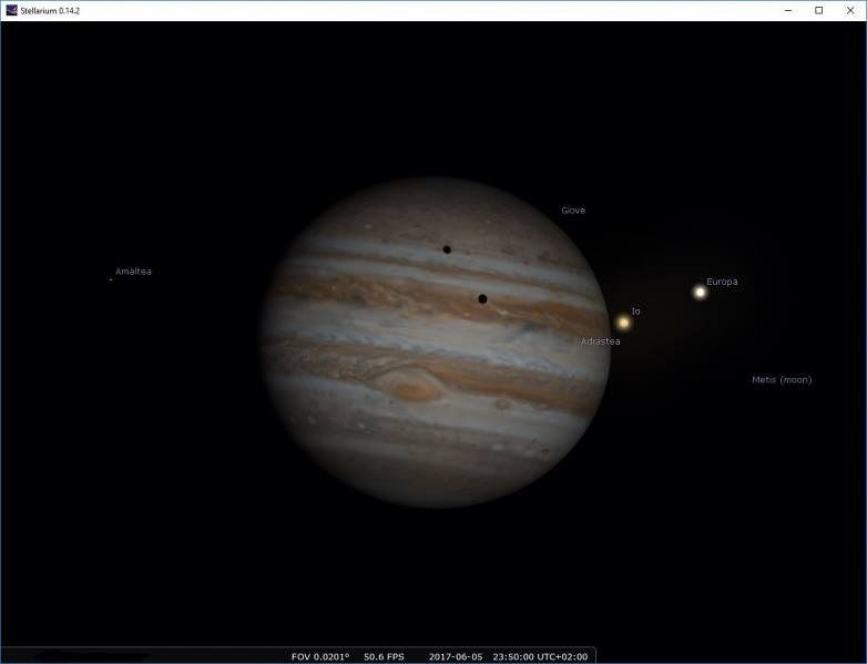 La notte del 5 giugno prossimo, tra le 22 e le 23, muniti di un buon telescopio, si potrà tentare l’osservazione di due delle 67 lune di Giove: Io ed Europa (scoperte da Galileo Galilei nel 1610).