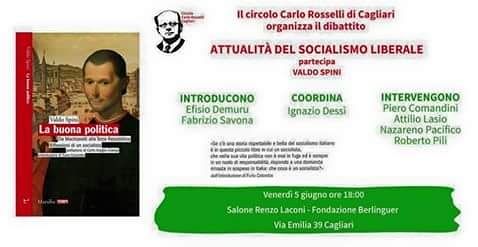 Sono invitati tutti coloro che – al di là delle appartenenze partitiche- credono nella necessita’ di recuperare i valori fondamentali del socialismo. Interverra’ l’ ex ministro Valdo Spini, che nell’ occasione presentera’ il suo ultimo libro ” La buona politica”. Introdurranno Efisio Demuru e Fabrizio Savona. Interventi di Piero Comandini, Attilio Lasio , Nazareno Pacifico e Roberto Pili. Coordinera’ Ignazio Dessi.