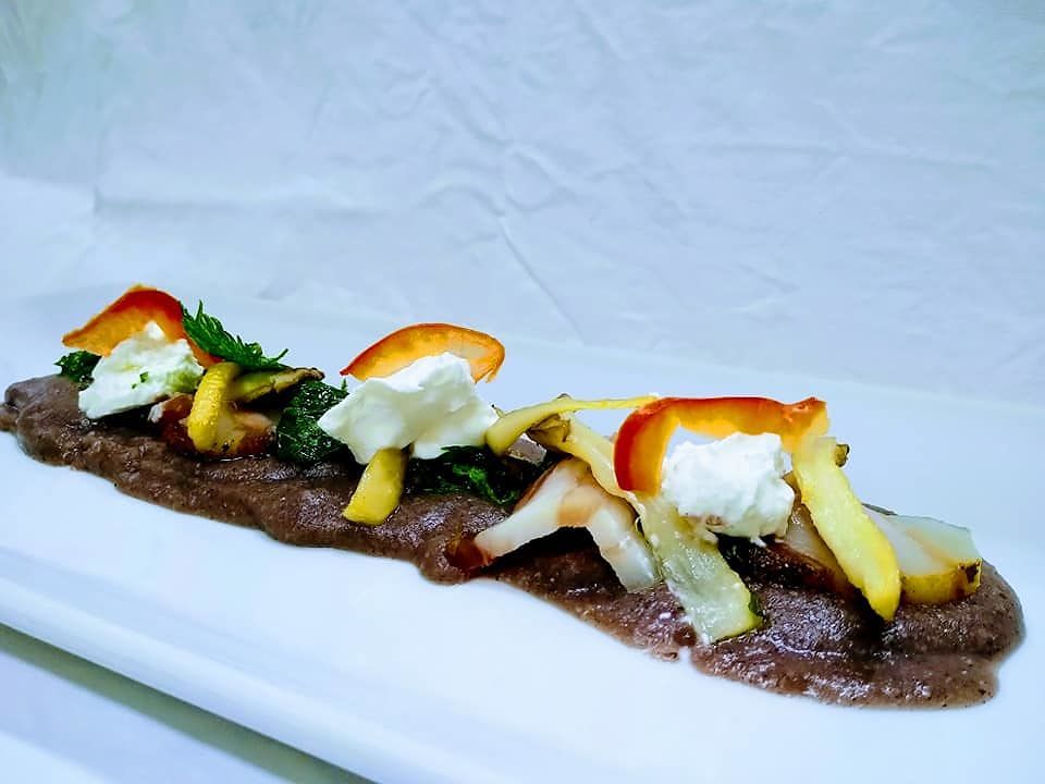 Gli ingredienti utilizzati? Eccoli: polenta annerita con riso Venere nero per ricordare il colore del carbone, funghi cardoncelli, ricotta Sirai, pancetta affumicata di Santadi, carciofi di Masainas, crema di ricotta Sirai e un filo di olio extravergine e chips di ortiche.