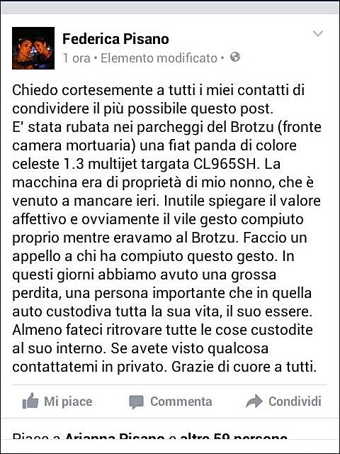 Ancora furti nei pressi dell’ospedale Brotzu di Cagliari. Stavolta, l’appello disperato di una lettrice sul web, sul proprio profilo Fb, in cui si chiede un aiuto a chiunque possa avere notizie su una Panda, quella del nonno, (venuto a mancare recentemente), rubata da ignoti. All’interno dell’auto, vi erano custoditi oggetti personali dell’uomo: «Faccio un appello a chi ha compiuto questo gesto – si legge nel post – in questi giorni abbiamo avuto una grossa perdita, una persona importante che in quell’auto custodiva tutta la sua vita, il suo essere. Almeno fateci ritrovare le cose custodite al suo interno. Grazie».