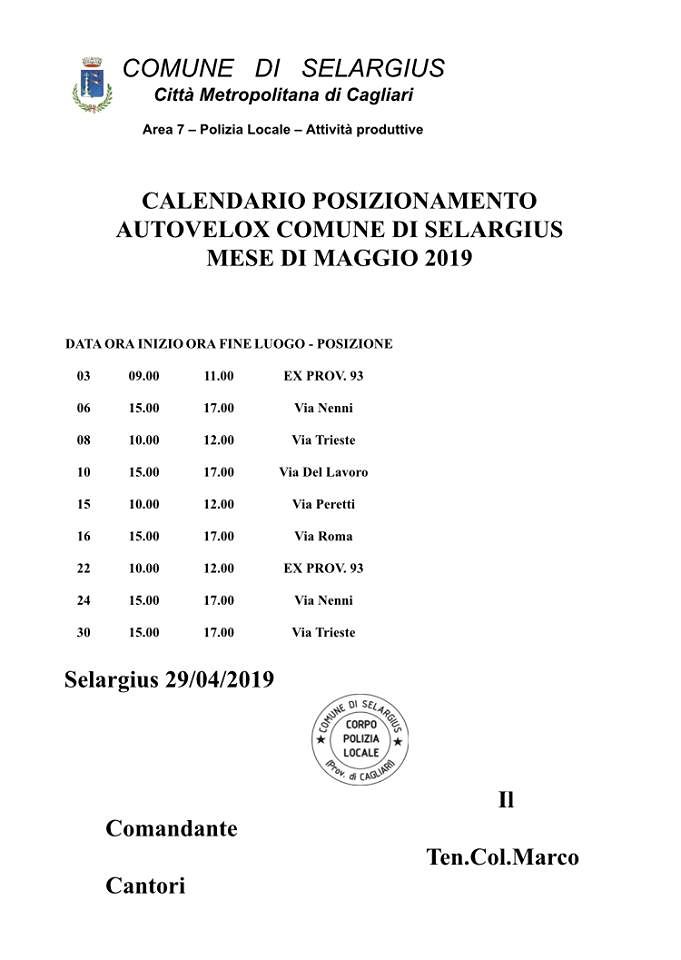 Autovelox a Selargius, il comune attraverso il comando di polizia municipale ha diffuso il calendario e le vie dove saranno posizionati i rilevatori di velocità nel mese di maggio. Ecco date e orari e le strade interessate.