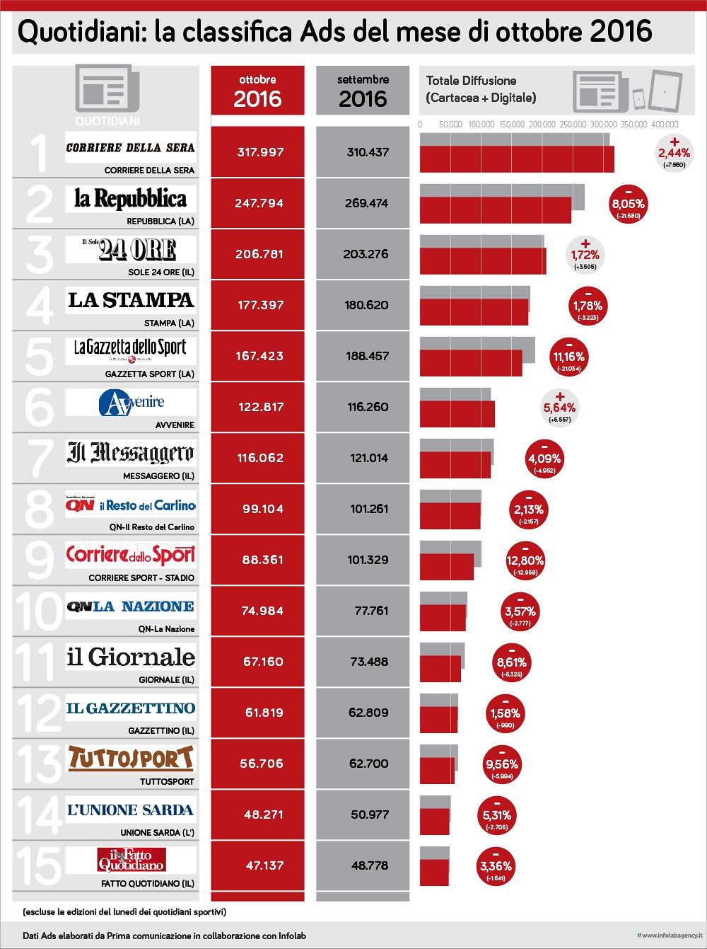 Quotidiani cartacei ancora in calo nel 2016. Il giornale specializzato Prima Online ha pubblicato oggi i dati Ads di diffusione del principali quotidiani nazionali e locali: non bene neanche la stampa sarda, l’Unione Sarda infatti in un solo mese da settembre a ottobre 2016 ha perso il 5,31 per cento delle copie.