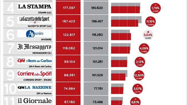 Nel totale tra copie cartaceee e digitali il quotidiano, passato proprio in quel periodo dalla direzione di Anthony Muroni a quella di Emanuele Dessì, è passato da 50977 copie giornaliere a 48271, non di vendite ma di sola diffusione. Rimane comunque il 14esimo quotidiano in Italia. Uno dei pochi giornali in crescita è invece l’Avvenire, in salita insieme al Corriere della Sera e al Sole 24 Ore. Nell’immagine, i dati della rivista Prima Online.