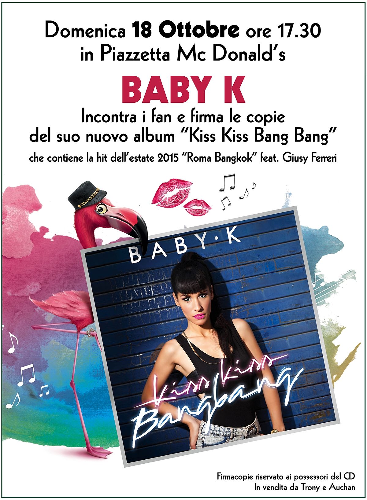 L’energia e lo stile di BABY K arrivano in Galleria. Domenica 18 ottobre, dalle ore 17.30, in Piazzetta Mc Donald’s, (Auchan Santa Gilla Cagliari), la nuova star del rap italiano incontra i fan e firma le copie del suo nuovo album “Kiss Kiss Bang Bang” che contiene la hit dell’estate 2015 “Da Roma a Bangkok” feat. Giusy Ferreri.