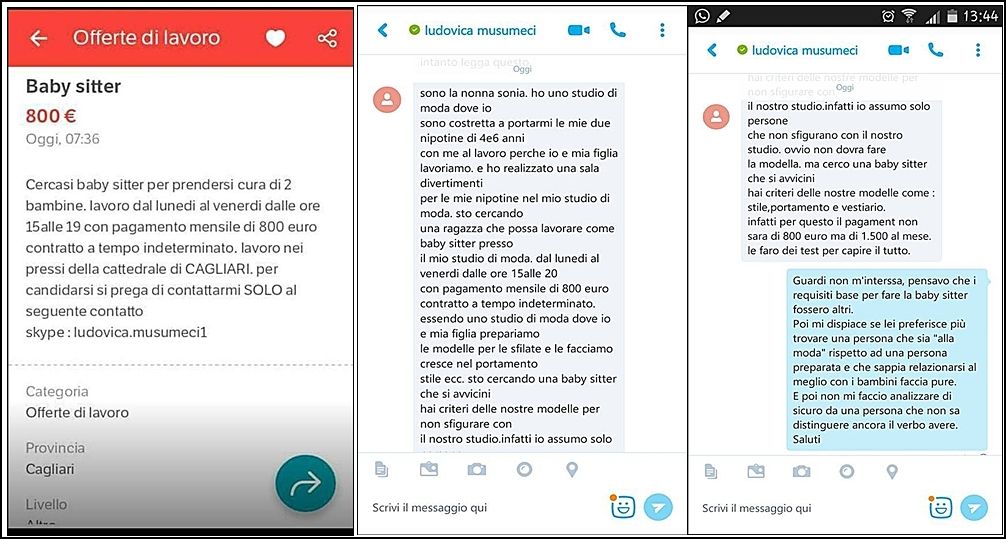 I RETROSCENA. Una ragazza cagliaritana cerca lavoro su Internet, e viene contattata su Skype. Ma è una trappola a sfondo sessuale, A raccontarla è la diretta protagonista, che intende così denunciare un episodio vergognoso: “Questa mattina ho risposto ad un annuncio di lavoro e così ho fatto, ho aggiunto il contatto e ho inviato un messaggio dicendo appunto che ero interessata all’annuncio ecc. Poco dopo trovo due chiamate perse e due messaggi con scritto “ci sei?”; rispondo scusandomi per non aver visto le chiamate in tempo. Mi arriva quindi un messaggio da parte di quella che dice di essere la nonna delle due bambine, la quale mi ha scritto questo messaggio : “sono la nonna sonia. ho uno studio di moda dove io sono costretta a portarmi le mie due nipotine di 4 e 6 anni con me al lavoro perche io e mia figlia lavoriamo. e ho realizzato una sala divertimenti per le mie nipotine nel mio studio di moda. Sto cercando una ragazza che possa lavorare come baby sitter presso il mio studio di moda. dal lunedi al venerdi dalle ore 15alle 20 con pagamento mensile di 800 euro contratto a tempo indeterminato. essendo uno studio di moda dove io e mia figlia prepariamo le modelle per le sfilate e le facciamo cresce nel portamento stile ecc. sto cercando una baby sitter che si avvicini hai criteri delle nostre modelle per non sfigurare con il nostro studio.infatti io assumo solo persone che non sfigurano con il nostro studio. ovvio non dovra fare la modella. ma cerco una baby sitter che si avvicini hai criteri delle nostre modelle come : stile,portamento e vestiario. infatti per questo il pagament non sara di 800 euro ma di 1.500 al mese. le faro dei test per capire il tutto”.