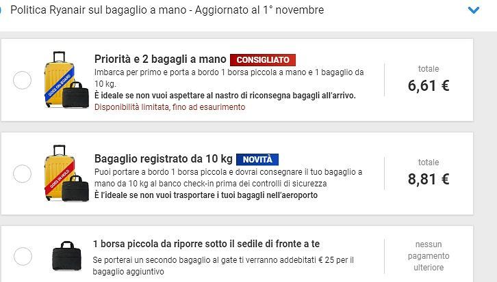 Ad oggi dunque il costo del trolley piccolo è dunque di 6,61 euro a tratta per il pacchetto Priorità e 2 bagagli a mano e 8,81 euro per il pacchetto Bagaglio registrato da 10 kg in stiva.