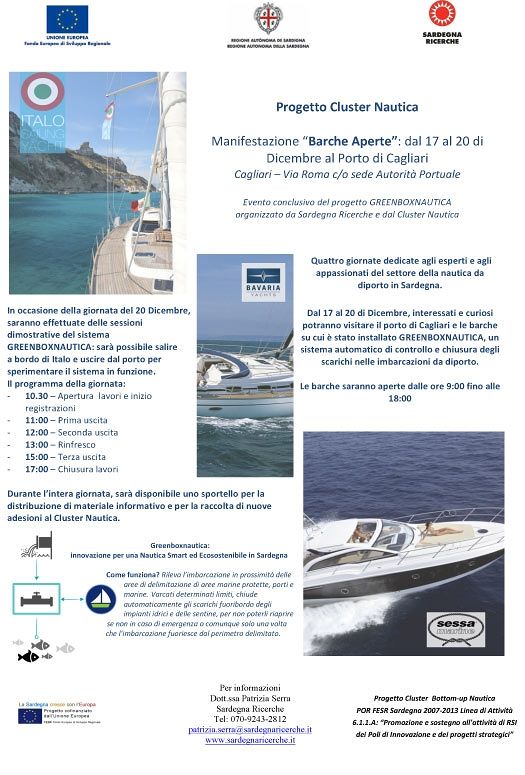 Da giovedì 17 a domenica 20 dicembre si terrà nel porto di Cagliari “Barche aperte”, evento che conclude per quest’anno le attività del Cluster Nautica promosso da Sardegna Ricerche. Per tutta la durata della manifestazione, dalle 9:00 alle 18:00, sarà possibile visitare le barche su cui è stato installato “GreenBoxNautica”, il sistema automatico di controllo e chiusura degli scarichi nelle imbarcazioni da diporto realizzato nell’ambito delle attività del cluster.