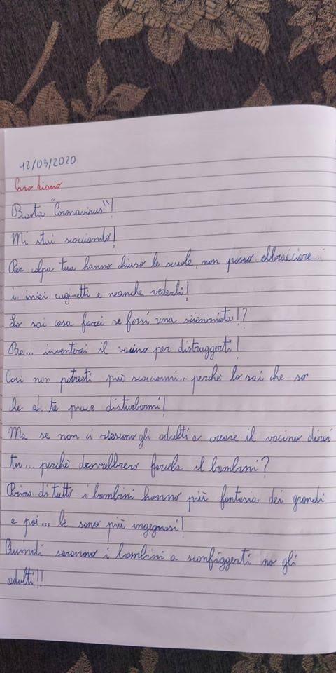 “Basta Coronavirus, mi hai scocciato! Per colpa tua non posso neanche più abbracciare i miei cuginetti…”. Il diario bellissimo di una bimba asseminese di 8 anni, spedito dalla mamma a Casteddu Online: “Ho pensato di mandarvi due pagine del diario della mia bambina di otto anni. La sua carissima maestra ha suggerito a lei e ai compagnetti di tenere un diario di questi giorni per raccontare e raccontarsi. Nella speranza di destarci al piú presto tutti con un sorriso da questo brutto incubo che dura troppi giorni”. E nelle due paginette del diario la bimba scrive parole bellissime, di rabbia e di speranza, come solo l’innocenza di una bambina può regalare. “Prima di tutto i bambini hanno più fantasia dei grandi, quindi saremo noi bambini a sconfiggere il virus….”.