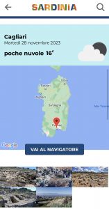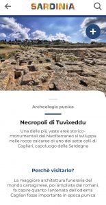 Facendo un semplice esempio, cliccando sul pallino posizionato sulla necropoli di Tuvixeddu, compare subito una fotografia con l’indicazione della categoria del monumento (“Archeologia punica”) e i chilometri di distanza dal luogo in cui l’utente sta effettuando la ricerca. Con un ulteriore click, un testo, breve ma esauriente e con la possibilità di approfondire, spiega di cosa si tratta e del perché la necropoli andrebbe visitata. La descrizione, accurata e minuziosa, è accompagnata da una galleria di immagini, dalle condizioni metereologiche in tempo reale, da un elenco di ulteriori siti potenzialmente interessanti e da quello, con annessa mappa, delle strutture ricettive aperte nelle vicinanze con indirizzo, numero telefonico ed email, contattatibili direttamente attraverso la app.