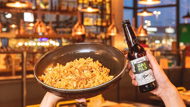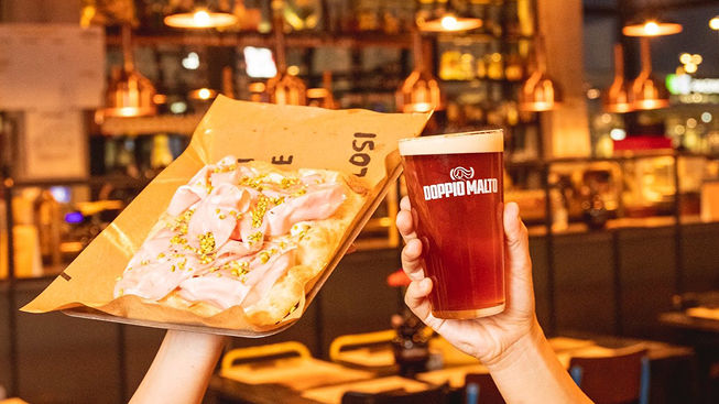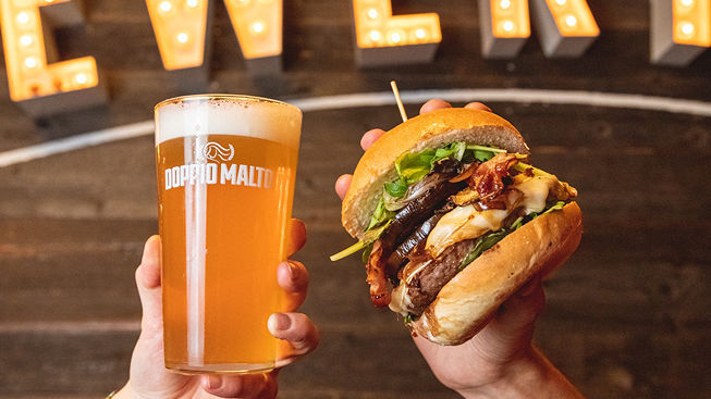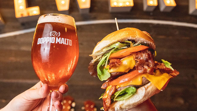 IL MENU DOPPIO MALTO. Il menù di Doppio Malto prevede proposte sia per il pranzo che per la cena. Come il galletto alla birra, marinato con spezie e glassato con la OakPils, una classica bionda stile pils ad alta fermentazione. Oppure il controfiletto di Black Angus: oltre 200 grammi di carne cotta alla brace e rifinita con sale Maldon e olio EVO. Non mancano le opzioni anche per i vegetariani, come il burger melanzana panata e Bufala o la focaccia Mortadella e stracciatella. Gli amanti di burger potranno sbizzarrirsi scegliendo tra oltre dieci proposte, dal classico Bacon e cheddar al più particolare Stracciatella e ‘nduja calabrese. Il mastro birraio vieta di non concludere con un dolce, scegliendo tra le numerose proposte tutte fatte in casa, come il gustosissimo Birramisù, bianco tiramisù con biscotti savoiardi inzuppati nella birra Old Jack e polvere di cioccolato.