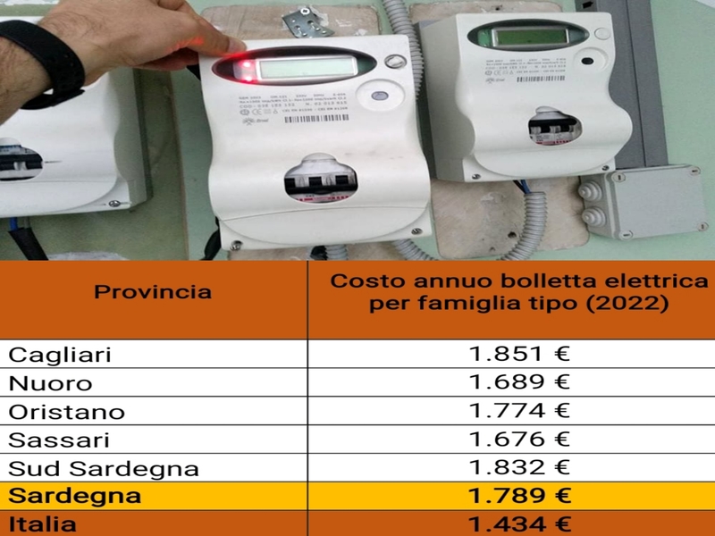 Bollette: in Sardegna nel 2022 si è speso il 108% in più per l’elettricità, Cagliari e Sud Sardegna le province più costose. A parità di consumi, le famiglie residenti in Sardegna con contratto di fornitura nel mercato tutelato, nel 2022 hanno speso per la sola bolletta elettrica 1789 euro, vale a dire il 108% in più rispetto al 2021. Il conto fa guadagnare alla Sardegna il primo posto nella classifica delle regioni dove si è speso di più per l’elettricità; prezzi così alti, a fronte di un consumo medio molto elevato, si spiegano con l’assenza di fornitura gas in molte parti dell’Isola, situazione che spesso viene compensata ricorrendo a dispositivi elettrici anche per il riscaldamento, con grossi impatti sulla bolletta.