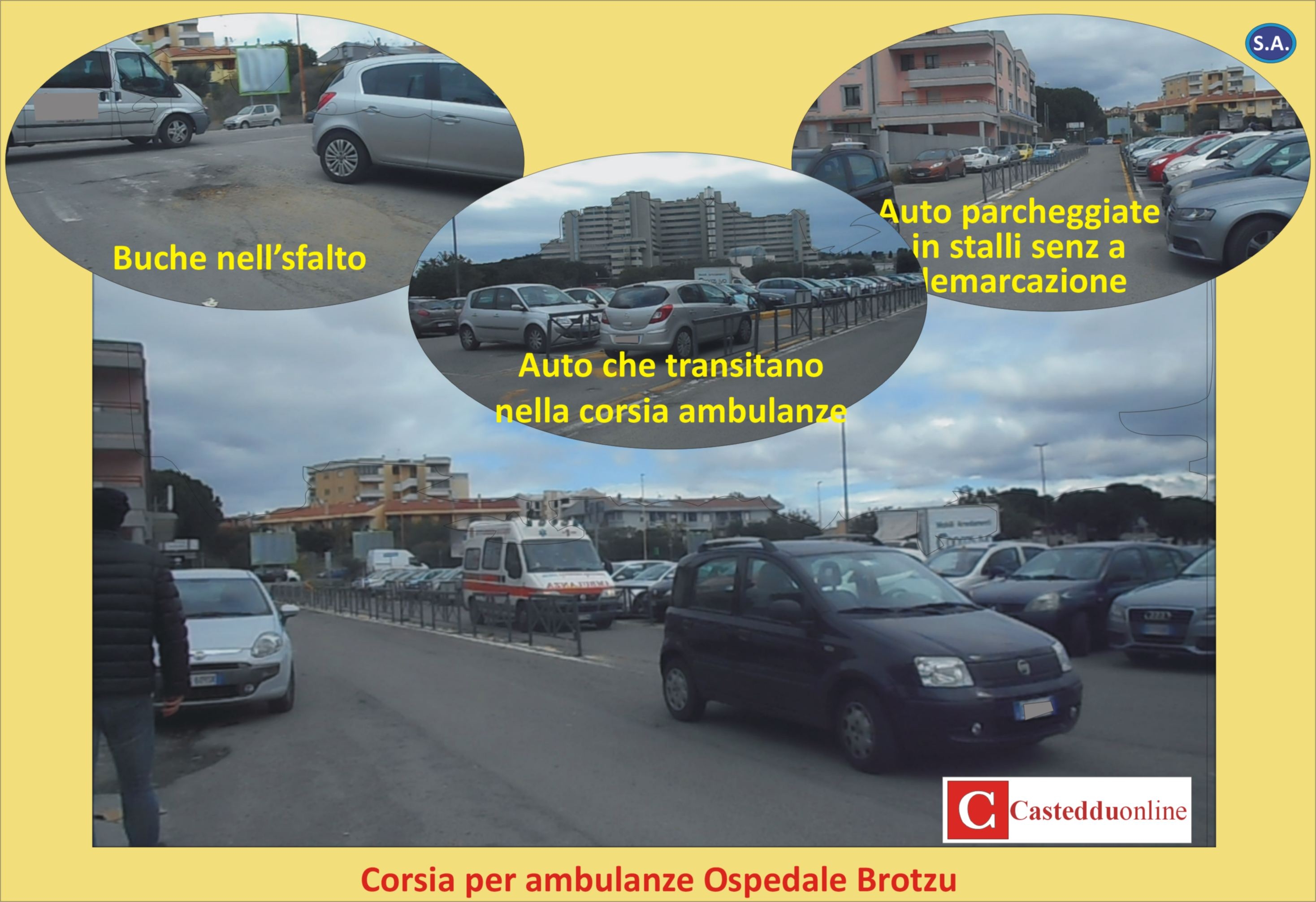 La corsia riservata all’ingresso delle ambulanze al lato dell’ospedale Brotzu è pericolosa, a causa delle tante auto che la percorrono, come se fosse una corsia preferenziale. Quell’accesso è anomalo in quanto le ambulanze che arrivano da Pirri devono tagliare la strada alle auto che transitano in direzione via Stamira.
