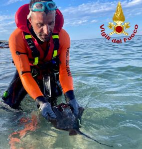 Giunti sul posto i soccorritori hanno rinvenuto il povero animale, che nuotava lentamente sul bagnasciuga, lo hanno raggiunto senza troppe difficoltà e lo hanno prelevato dal posto con l’intento di liberarlo al largo, in acque più adatte.