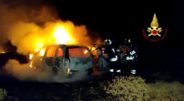 Intervento dei Vigili del Fuoco del Comando di Cagliari all’1 circa di questa notte per spegnere le fiamme che hanno coinvolto tre auto in sosta e la vegetazione circostante in un’area rurale dietro la Motorizzazione Civile di Cagliari, nei pressi della strada statale 554.