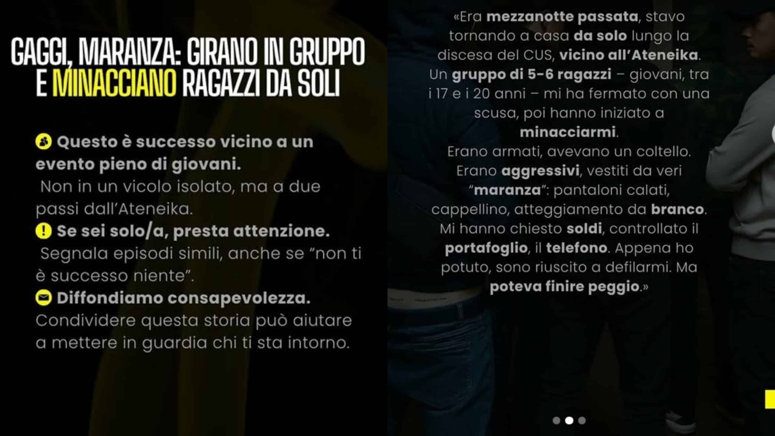 Questa è la testimonianza reale di chi ha vissuto l’episodio sulla propria pelle e ci ha chiesto di restare anonimo. Questo post serve a mettere in guardia. Perché può capitare a chiunque, soprattutto a chi si sposta da solo, di notte, in zone frequentate ma poco controllate”. “Si chiamano gaggi, maranza, teppistelli… ma il risultato non cambia”, forse addirittura minorenni e soprattutto armati. Nel post, centinaia di commenti con altre testimonianze soprattutto da parte di genitori che hanno raccontato quanto accaduto ai propri figli.