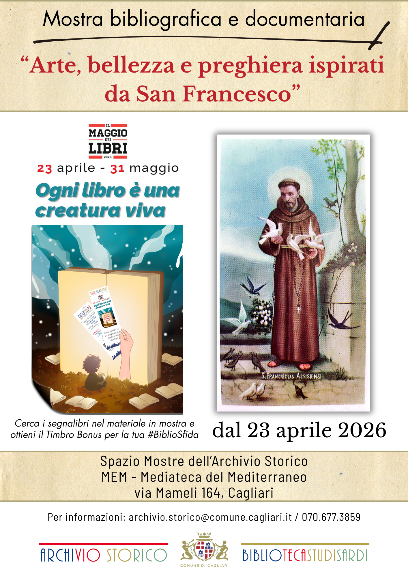 Visitabile allo Spazio Mostre dell’Archivio Storico della MEM–Mediateca del Mediterraneo, in via Mameli 164, la mostra bibliografica e documentaria “Arte, bellezza e preghiera ispirati da San Francesco”.
