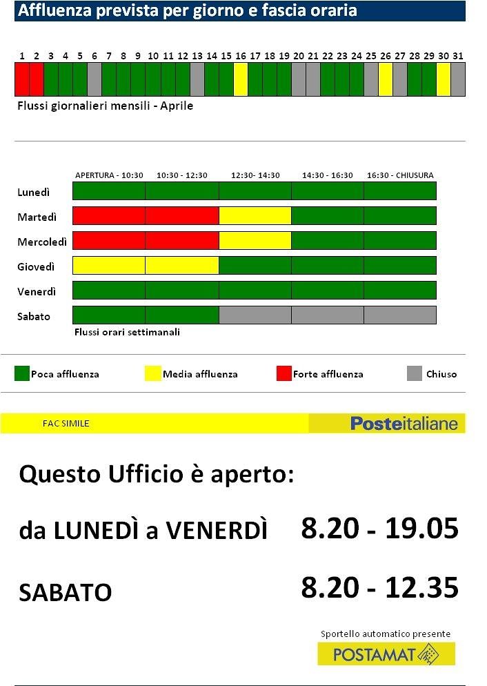 Il verde indica giorni e fasce orarie con pochi clienti e con attesa minima, il giallo specifica un numero di clienti e un’attesa appena superiori alla media e il rosso prevede picchi di affluenza di un certo rilievo e relativi tempi di attesa prolungati.