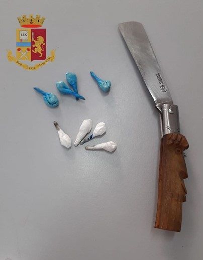Dopo avere raccolto l’involucro contenente otto piccoli pezzi di plastica, è stato sottoposto a perquisizione personale dove gli Agenti hanno trovato un coltello a serramanico dalla lunghezza di 16 cm occultato nei pantaloni. Lo stupefacente rinvenuto e sequestrato era composto da quattro pezzi di cocaina e quattro di eroina.