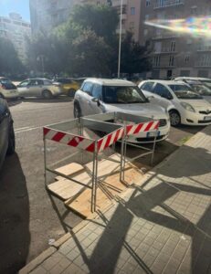 Il caso riguarda via dei Capraia, all’altezza dei civici 18-20, proprio davanti all’ingresso del pastificio-pasticceria “Le Delizie di Boi Bonaria”. Qui, da anni, l’asfalto mostra segni evidenti di cedimento: prima un avvallamento della carreggiata, poi l’apertura di una vera e propria feritoia nel manto stradale. Per contenere il pericolo sono state posizionate assi di legno e transenne, una soluzione provvisoria che però si è trasformata in una presenza fissa, con inevitabili disagi per pedoni, clienti e residenti.