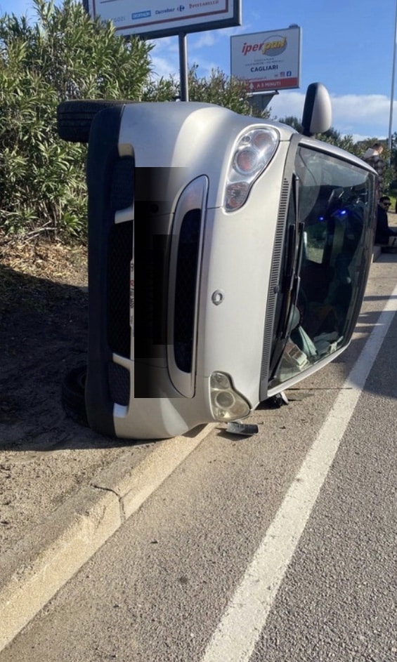 Momenti di paura in viale Monastir a Cagliari. Un’auto, per motivi ancora da accertare, si è ribaltata su un fianco finendo sul marciapiede.
