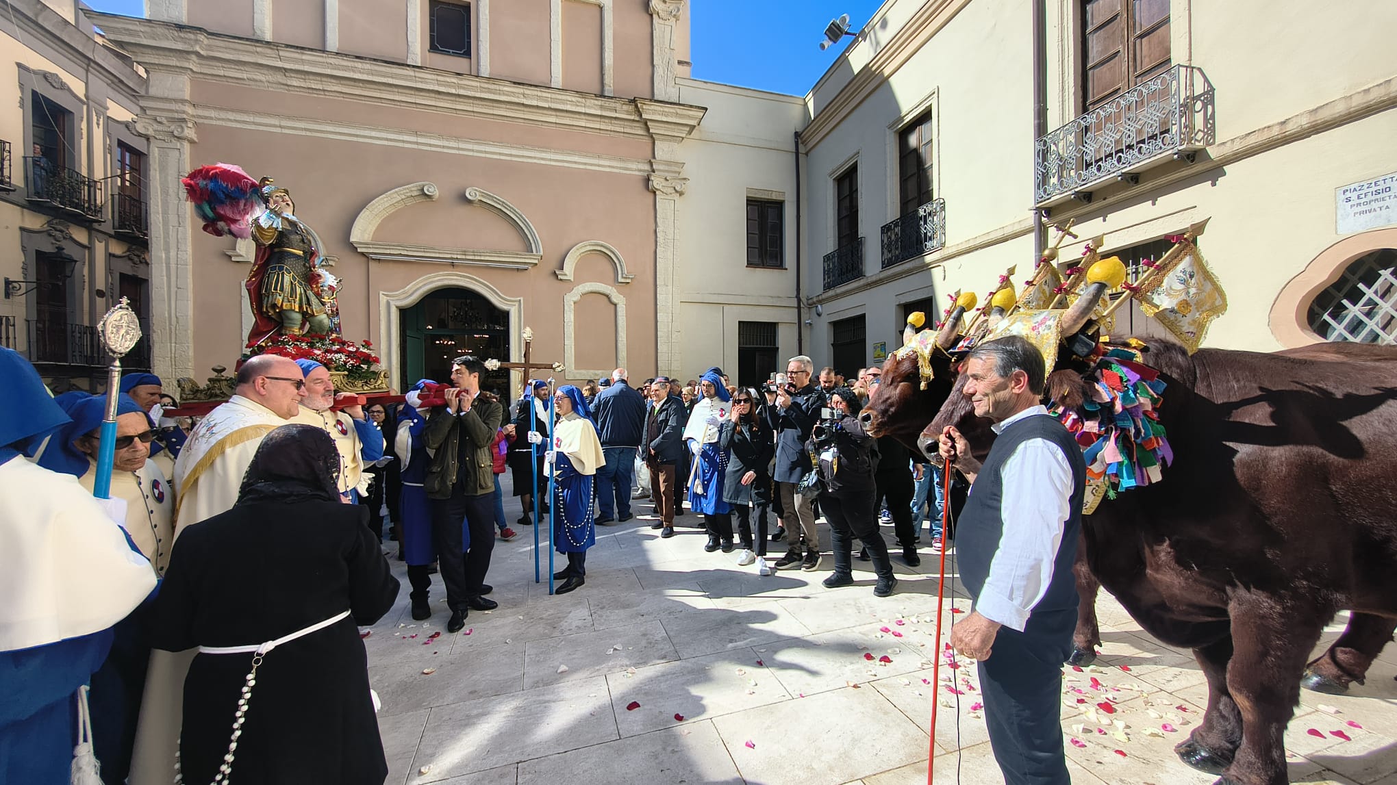 Sono stati benedetti per la prima volta i buoi del cocchio di Sant’Efisio. Sono stati chiamati “Ti stimu po Cantu bivu”. Prima il Santo è arrivato in Cattedrale dove è stata celebrata la Santa Messa e poi è avvenuta la benedizione.