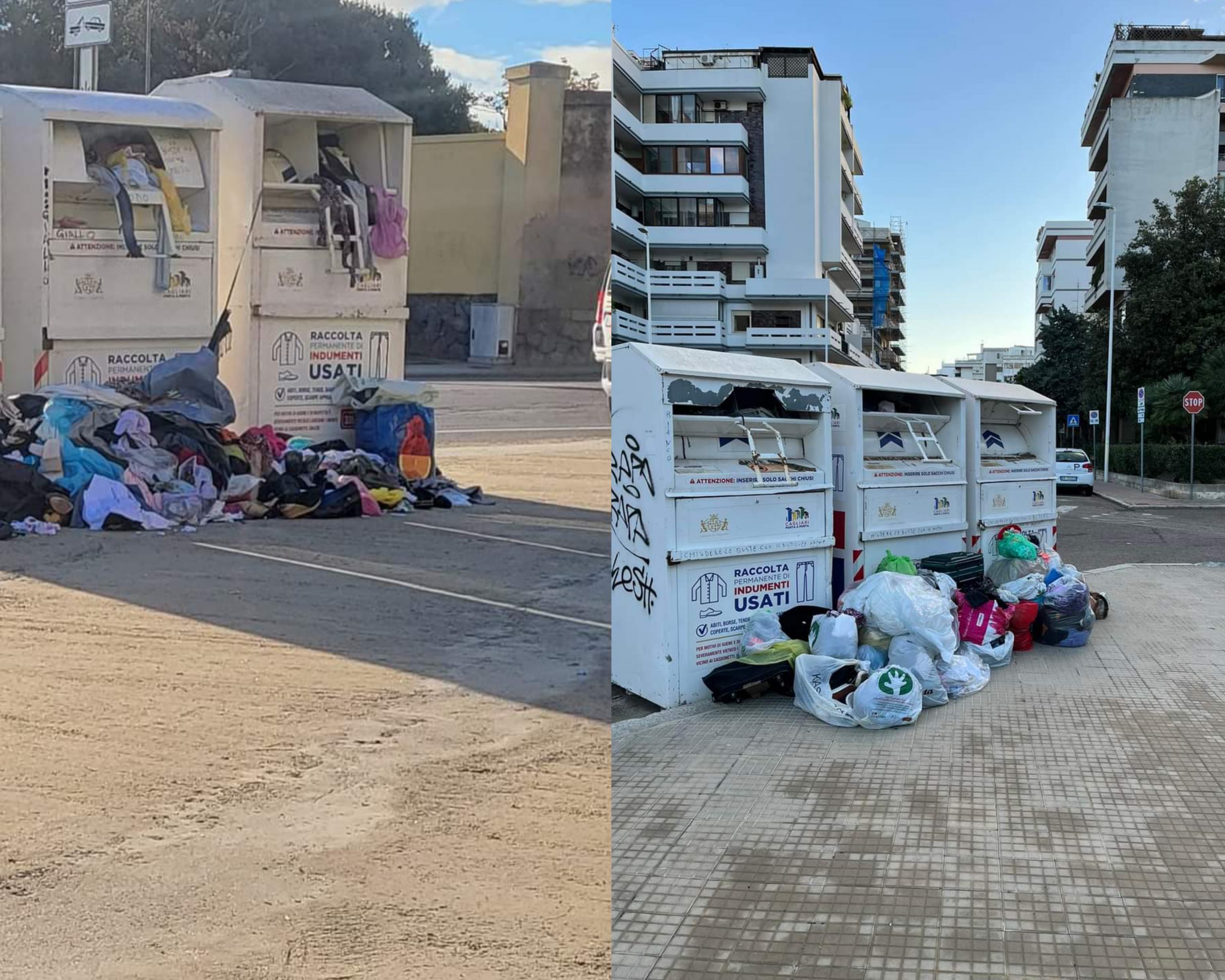 È in netto ritardo il ritiro degli abiti usati lasciato dai cagliaritani nei maxi cassonetti bianchi di una società privata del Lazio che, sfruttando la classificazione di jeans, camicie, giubbotti e scarpe come “rifiuti”, li prende a costo zero e poi li rivende anche all’estero. Servizio bloccato, in panne, ormai da settimane. E da Genneruxi a San Benedetto, passando per la zona di piazza Repubblica e sino ad arrivare al Parco della musica di Cagliari, lo spettacolo degradante è praticamente identico. Maniglioni bianchi abbassati, abiti che fuoriescono dai contenitori ormai intasati e sciacalli felici.